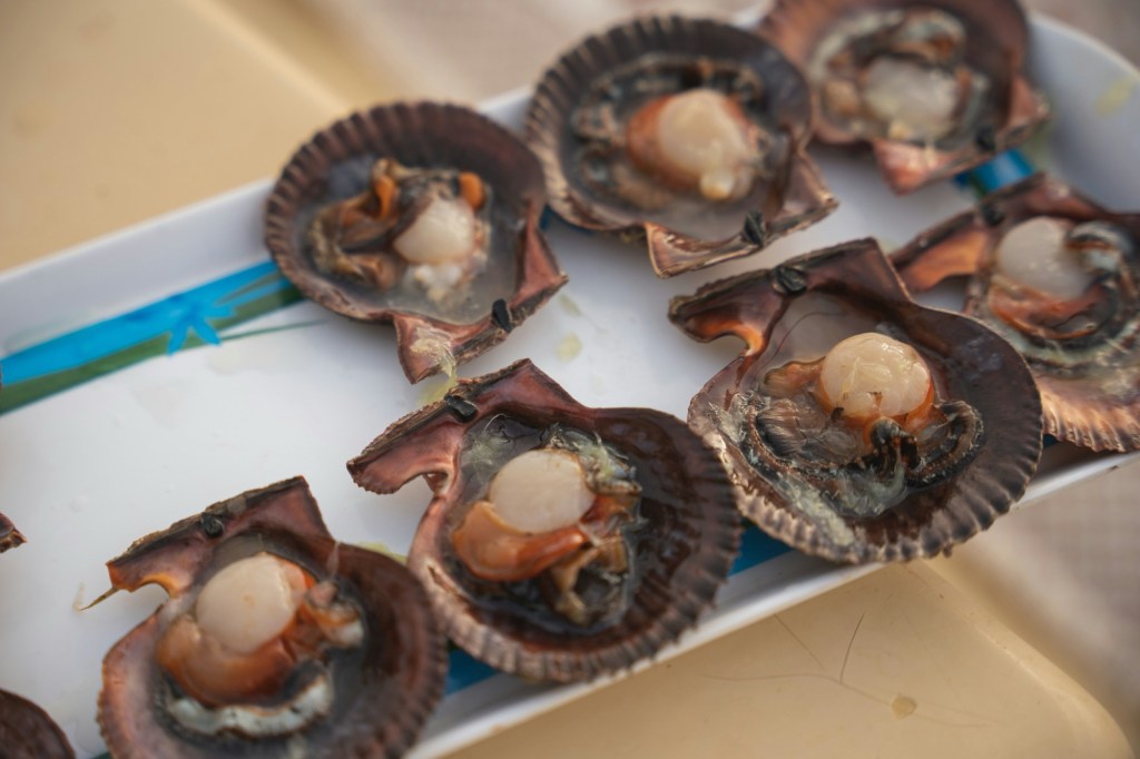 Scallops are marine shellfish belonging to the mollusk family and are found only in saltwater oceans and seas around the world. They typically live on sandy or muddy sea floors in shallow coastal waters, including the mekuen river in Ikoyi and imoba land,though some species inhabit deeper oceans, and unlike many shellfish, they can swim short distances by clapping their fan-shaped shells together to escape predators. Their shells are usually white, brown, or orange, and they have a row of tiny blue eyes along the shell edges that help them detect movement and danger. Scallops feed by filtering plankton from the water, and the main edible part is the strong adductor muscle used to open and close the shell. Size varies by species, with smaller scallops measuring only a few centimeters and larger sea scallops growing up to about 20 centimeters wide, while the edible muscle remains much smaller. They are widely enjoyed in cooking and are often seared or grilled to preserve their tender, flavorful texture, since cooking them too long can make the meat rubbery.